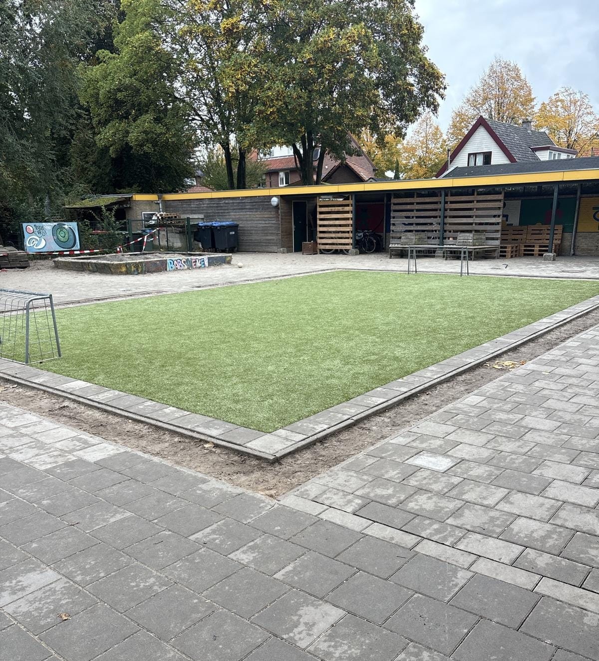 Naast de nieuwe bestrating zijn houtsnippers, valondergronden, een voetbalveld met kunstgras en een milieuvriendelijke wand van wilgentakken aangebracht.