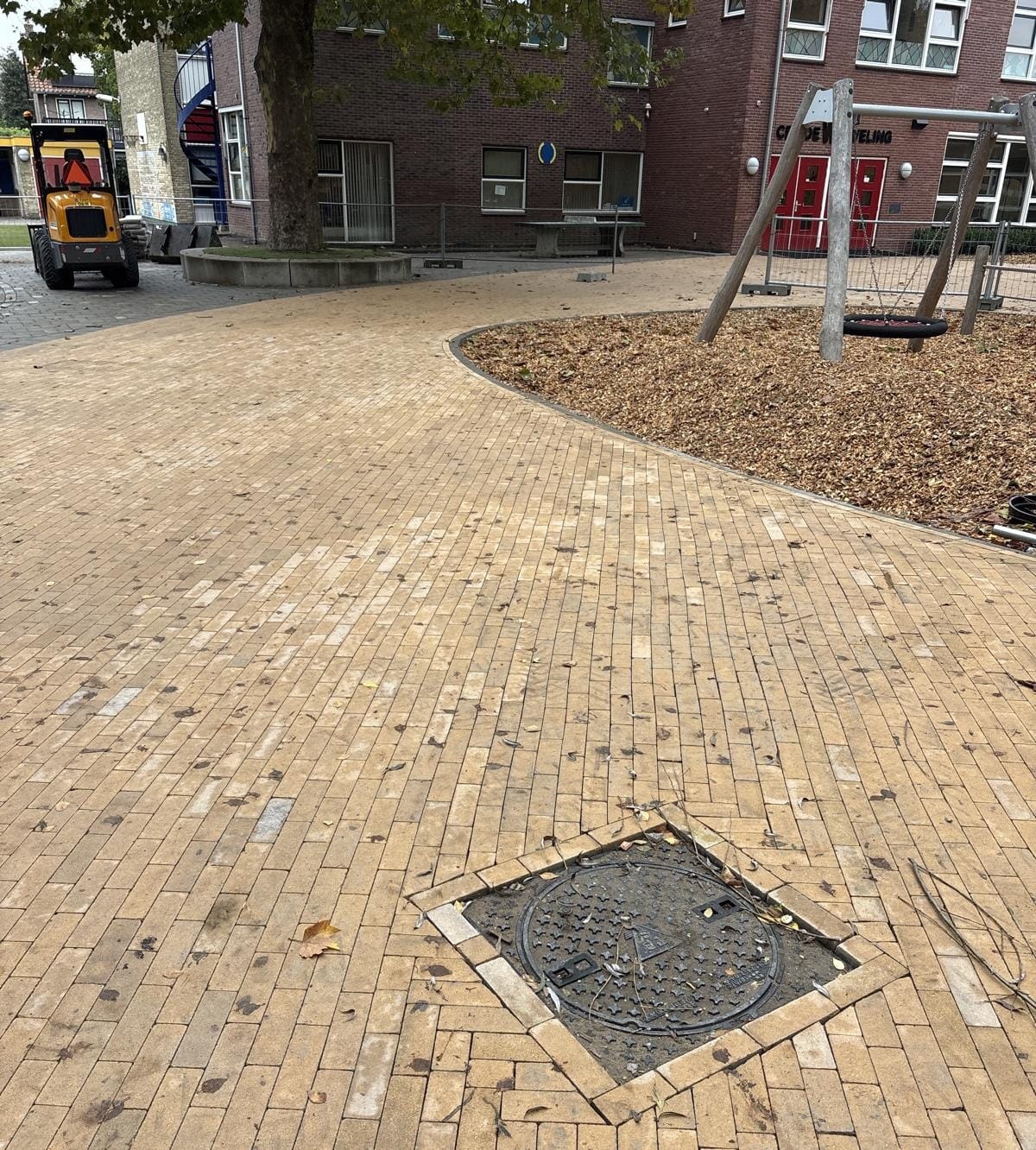 Maar wat je niet kunt zien, maar zeker zo belangrijk is, is wat er onder de grond gedaan is. Het regenwater van het schooldak is afgekoppeld van het vuilwaterriool en wordt nu opgevangen in een krattensysteem onder de verharding. In het krattensysteem wordt het water bij een zware regenbui gebufferd, waarna het langzaam weer terug stroomt naar het grondwaterniveau.